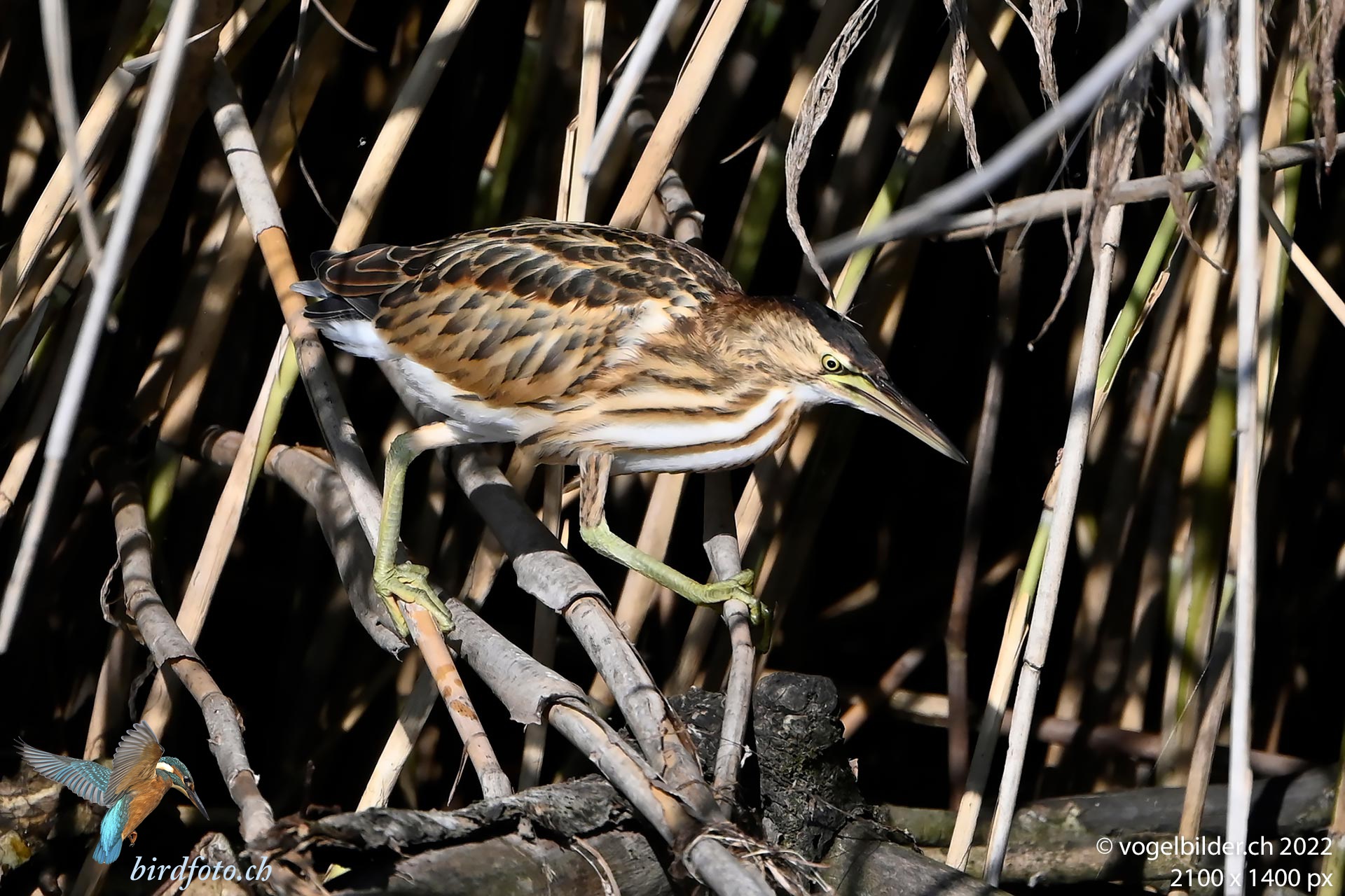 eine diesjährige Zwergdommel sucht auf sich allein gestellt nach nahrung am Schilfrand