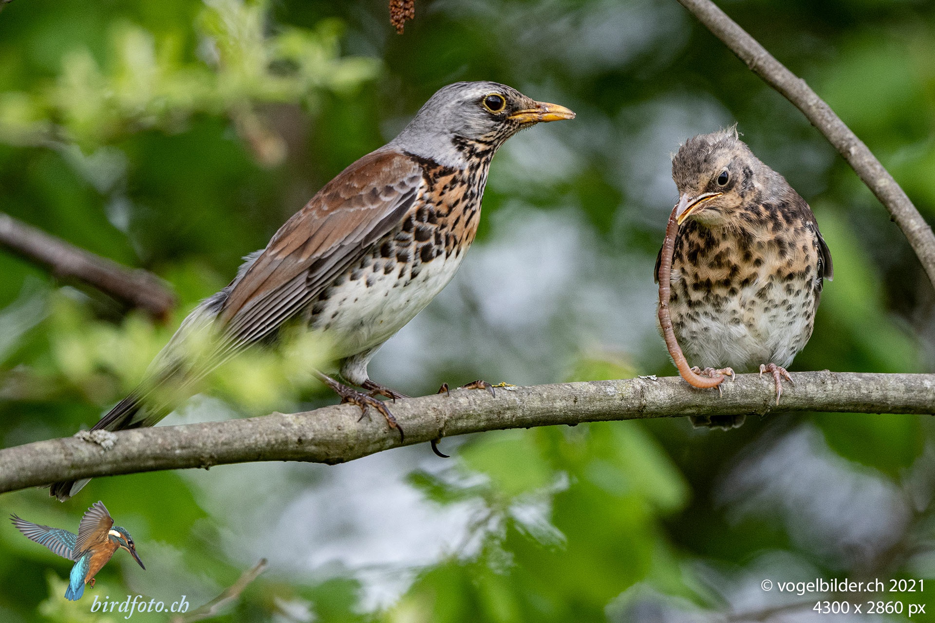 Mitte Mai ist es laut bei den Wacholderdrosseln, die Jungen haben das Nest verlassen und benötigen noch eine grosse Menge Futter.