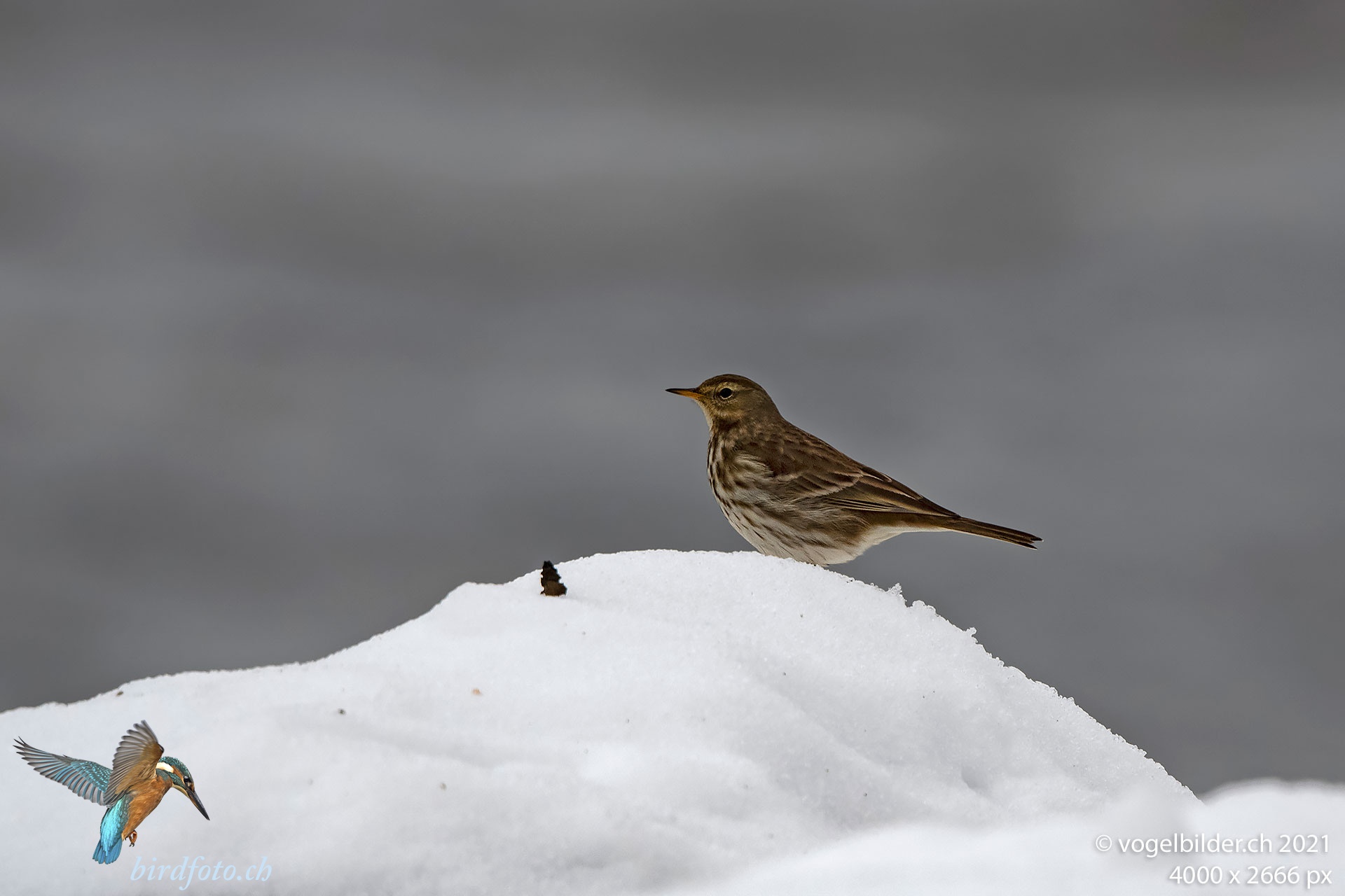 Entlang der Limmat suchen die Bergpieper mit Vorliebe auf dem Schnee nach Nahrung. Sie sind sehr scheu.
