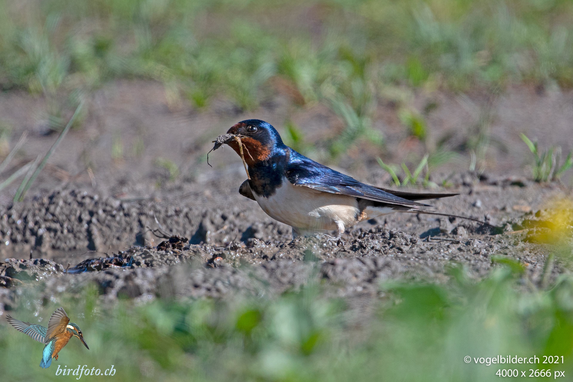 Die Schwalben bauen ihre Nester mit nasser Erde / Lehm. Sie nutzen Karrenspuren nach Regenfall, sind beim Zusammensammeln aber sehr vorsichtig.