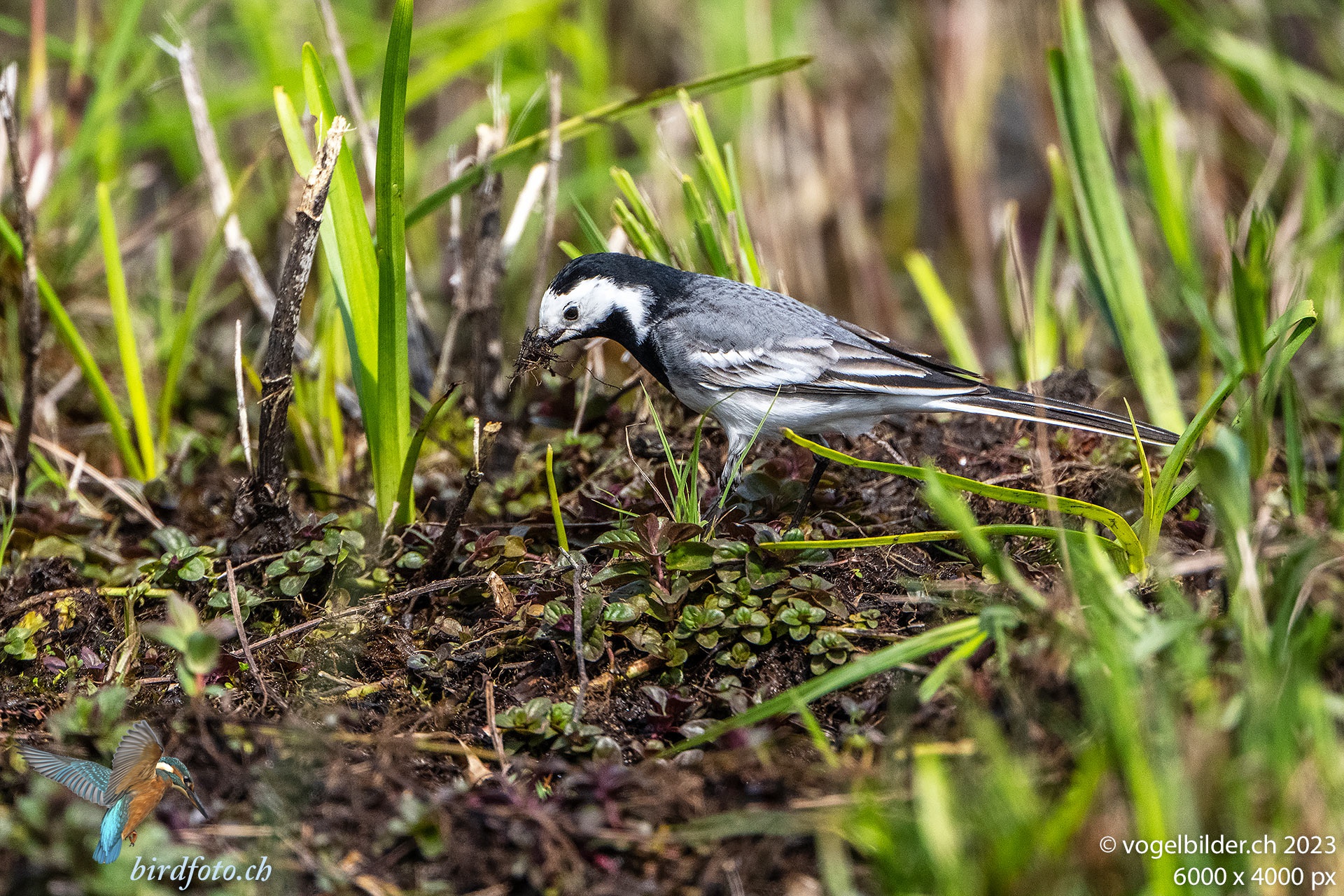 Die Bachstelze sammelt Nistmaterial für ihr Nest in der Beobachtungshütte